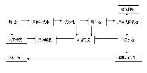 即采用人工清糞,豬舍內的豬糞利用人工清運到封閉糞場,豬尿及少量沖舍糞水流入污水處理系統,進入初沉池,沉去細小的懸浮物,糞渣與豬舍內人工清運的糞渣直接運到糞場。這種方法雖然增加了人工費,但每天用水量可大大減少,一般可比“水沖糞法”減少三分之二;排出污水的COD值只有前法的75%左右,BOD值只有前法的40-50%,SS只有前法的50-70%,污水更容易處理;污水池的投資少,占地面積小,日常維持費用低。