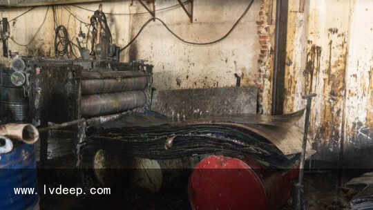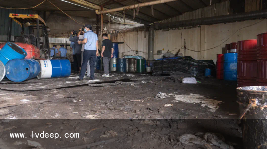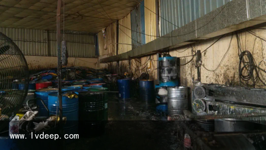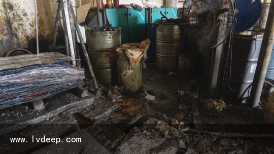 「現(xiàn)場(chǎng)用于壓平桶身的平整機(jī) 」 處置懲罰過程中工人任由廢鐵桶里面的殘留物流出地面滿是黏糊糊的不明物質(zhì)車間內(nèi)彌漫著刺鼻的氣味可見現(xiàn)場(chǎng)揮發(fā)性有機(jī)化合物氣體 的濃度十分高在切割過程中極易發(fā)生爆炸