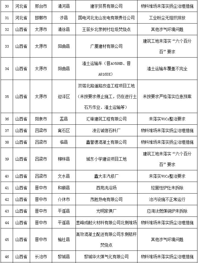 工作組發現,山西省臨汾市蒲縣有1家礦山企業未落實防塵降塵措施。河北省秦皇島市青龍縣青杖子村沙河旁,滄州市新華區小趙莊鄉孫莊子村、東光縣大單鎮西北側;山西省太原市清徐縣王答鄉北錄樹村,晉中市榆社縣高效混凝土配送有限公司東側;河南省新鄉市國家新鄉經濟技術開發區海潑農機汽修部、新鄉縣合河鄉新王線,洛陽市洛寧縣福寧大道;陜西省渭南市蒲城縣陳莊鎮三永村存在露天焚燒現象。