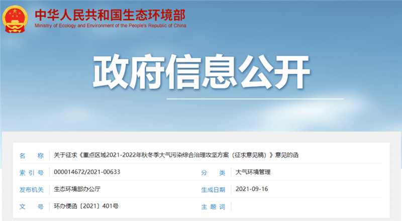 為深入打好污染防治攻堅(jiān)戰(zhàn),持續(xù)改善重點(diǎn)區(qū)域秋冬季環(huán)境空氣質(zhì)量,生態(tài)環(huán)境部起草了《重點(diǎn)區(qū)域2021-2022年秋冬季大氣污染綜合治理攻堅(jiān)方案(征求意見稿)》。要求于2021年9月22日前反饋。